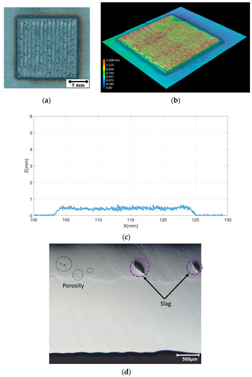 Figure 12a,b presents the top view and 3D profile of the deposited clad layer, respectively. It can be seen that the clad layer is defect-free at the macroscale. The partially melted powders are observed on the surface of the clad layers, which is typically seen during the LDED-PF deposition. The waviness pattern on the surface is mainly due to the linear scanning strategy deployed for the study. Figure 12c presents the surface profile of the top layer of deposition along a central plane, which indicates a maximum surface deviation of 0.42 mm on the surface. Figure 12d presents the cross-section of the multi-track clad layer. The clad layer is largely defect-free in nature. It shows sound metallurgical bonding between the substrate and clad layer without any sign of delamination or defects in the fusion zone. The curvature of the fusion zone proves that substantial melting of the substrate material occurred. Micro-pores are seen at some locations, which are a mix of spherical and elongated pores. The spherical pores are gas pores that may be developed during laser cladding due to gas entrapment in the melt pool. In addition, as gas-atomized powders are used for deposition, the gas pores can also be due to pores trapped inside the powder particles during powder production. The irregular pores are due to a lack of complete fusion at some locations during the deposition.