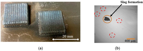 Micro-hardness measurements along the clad layer show the hardness ranges from 240 to 285 HV, with a hardness of ~225 HV at the substrate as shown in Figure 14a. A comparison with the literature shows that similar hardness values are observed for Fe–Cr–Al wire deposited using laser welding [33]. Hardness indentations are taken at the slag layer, and a microhardness in the range of 1088–1276 HV is observed. In addition, cracks are seen to originate from the tip of the indentation, indicating the brittle nature of the slag layer as seen in Figure 14b.