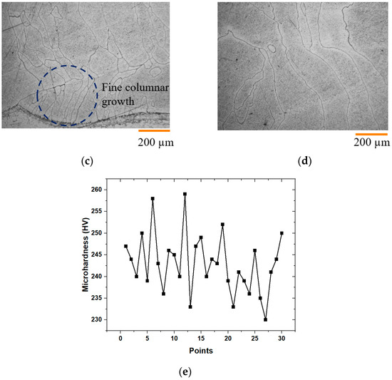 The microstructure of the clad layer is presented in Figure 13b. The presence of elongated and spherical pores discussed previously can be seen with the ~15 µm size. The microstructure is primarily columnar in nature, which is mainly oriented parallel to the build direction. However, the inclination of the grain growth is evident along the cross-section, which is produced by the curvature of the melt pool. During the LDED-PF process, the powder was captured by the high-energy laser and a melt pool was formed. The heat flow was mainly dissipated from the melt pool to the substrate, which led to a high-temperature gradient. The grains prefer to grow opposite to the direction of heat transfer. It can also be seen that the average grain size is ~125 µm in the bottom zone of the clad, while the grain size is ~170–180 µm in the top region of the clad.