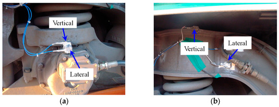 Accelerometers on axle box and bogie: (a) axle box-mounted accelerometers; (b) bogie-mounted accelerometers [12].