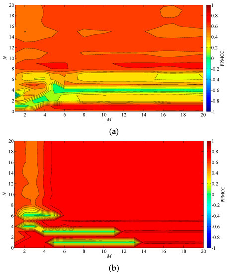 PPMCC contour plots using estimated displacement from measured acceleration: (a) lateral direction; (b) vertical direction.