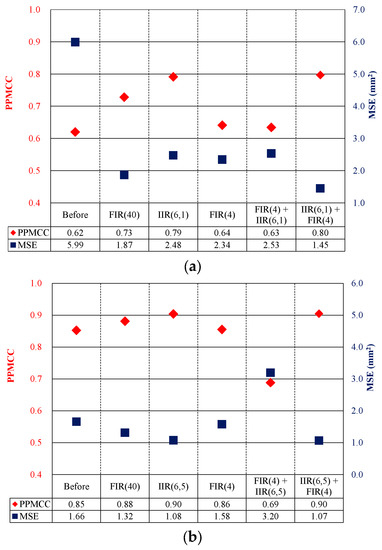 In Figure 6a, for the lateral direction, it is found that the PPMCC value is increased when a single IIR(6,1) or FIR(4) is used. However, the MSE for the IIR(6,1) model is higher than that of the FIR(4) or FIR(40) models. A hybrid IIR/FIR model, which applies the FIR(4) after the IIR(6,1), results in the highest PPMCC and the lowest MSE. On the contrary, the worst result is obtained when the sequence of the filters is reversed, i.e., the IIR(6,1) is applied after the FIR(4). Hence, it is confirmed that the hybrid IIR/FIR model is adequate and appropriate for estimating lateral track irregularity. In Figure 6b, for the vertical direction, it is found that the PPMCC and the MSE slightly improve when a single IIR(6,5) model is used. The effect of using a hybrid IIR/FIR model is moderate, and a hybrid FIR/IIR model worsens the result. Therefore, it is confirmed that a single IIR model would be sufficient to estimate the vertical track irregularity.