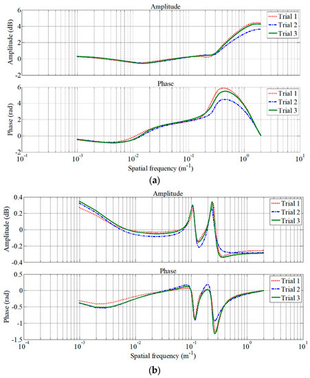 The spatial frequency responses of the derived models are shown in Figure 7. As mentioned in the introduction, the models are used to compensate for the discrepancies caused by the lateral motion of the axle box or the bogie relative to the track and the phase delay of the previous filters. Therefore, the model in the lateral direction has larger value than that in the vertical direction. Data from two additional test campaigns, carried out within a six-month interval after the first test, are used to ensure the reproducibility of the proposed models. Despite the six-month interval between the first and the third trials, the frequency responses of both directions are consistent. Therefore, it is safe to conclude that the models are reliable and can be applied to estimate track irregularities.