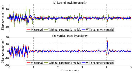 The derived parametric models are applied to estimate track irregularities from the acceleration signals obtained from the HSR-350x train on which the TGIS is installed. The results in the spatial domain are shown in Figure 9. In the lateral direction, the irregularity estimated without the parametric model overestimates the track irregularity, while the derived models ensure the estimated results are close to the measured track irregularity. In the vertical direction, all results are consistent, and no significant improvements are observed regardless of the model used.