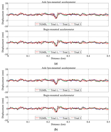 Track irregularities, defined as deviations from the original track geometry, are usually measured with a track inspection vehicle equipped with special measurement devices using contact probes, lasers, or optical sensors [1,2]. However, using this inspection vehicle with measuring devices is costly and complicated. In addition, the dynamic characteristics of a track inspection vehicle are different from those of a high-speed train in commercial operation, so the dynamic deflection of the track caused by a high-speed train cannot be appropriately measured. As an alternative, a simple and inexpensive device using accelerometers installed on an in-service vehicle has drawn attention because it can be used for daily monitoring of track conditions. Theoretically, displacement can simply be estimated by double integrating acceleration. However, in practice, the integration usually yields unwanted drifts due to the non-zero initial condition of the signal, the direct current (DC) offsets, or the noise due to electrical/mechanical hysteresis in sensors or cables [3]. To avoid these drawbacks, many researchers have proposed model-based methods. In these methods, system models are required, which can represent the input–output relationship between acceleration and track irregularities.