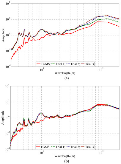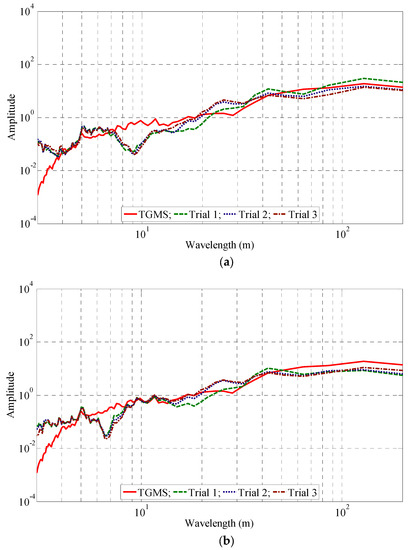 To examine the applicability of the derived models, they were used to estimate track irregularities from the signals obtained using the accelerometers installed on the axle box and the bogie of a KTX train in operation. A section of the slab track with notable lateral and vertical track irregularities was selected for comparison. The reference measurement with the TGIS was carried out approximately one year before the measurement tests with the in-service train. The slab track was selected because the variations in time are expected to be smaller than those for the ballasted track. Three measurement tests were carried out within a one-week interval to ensure the reproducibility of the methodology, and the results were compared in the spatial and the wavelength domains as shown in Figure 11, Figure 12 and Figure 13. The maximum train speed in these test campaigns was 300 km/h. The discrepancies were presumed to be a result of the differences in the suspension characteristics and wheel profiles of the KTX train and HSR-350x train.