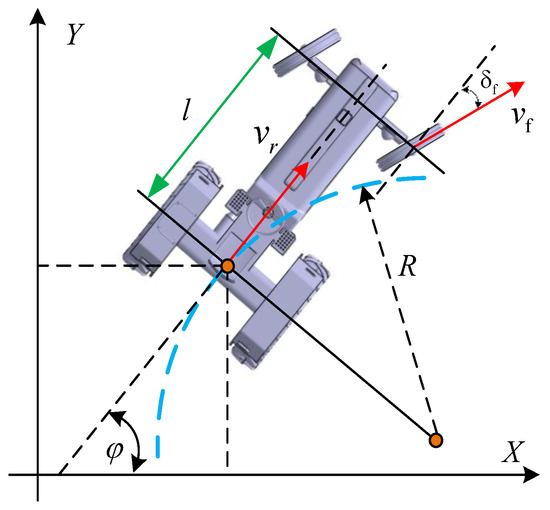 where (x, y) are the coordinates of the rear-axle-center of the wheeled tractor, is the heading angle of the wheeled tractor, is the front wheel deflection angle, is the rear-axle-center speed of the wheeled tractor, is the front-axle-center speed of the wheeled tractor, l is the wheelbase, R is the rear wheel steering radius.