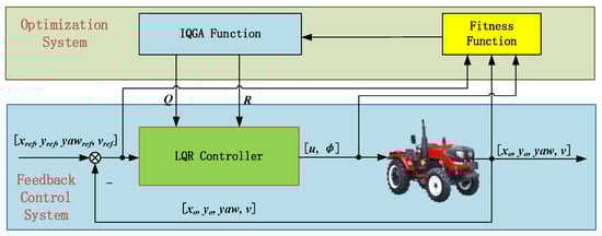 In this paper, a kinematic model of the wheel tractor was built based on the Ackermann steering model, the state weighting matrix in the LQR controller was optimized using IQGA, and finally, a joint simulation was performed using Carsim and MATLAB. The simulation results after comparing the other four optimization algorithms showed that: