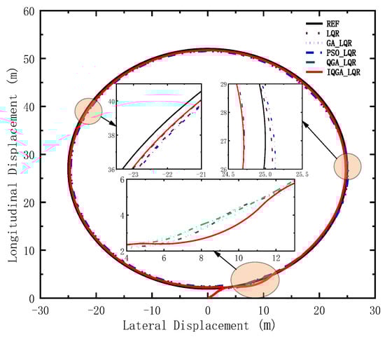 Compared with QGA-LQR, the IQGA-LQR controller increased the maximum value of the lateral displacement deviation of the tractor by 13.05%, reduced the minimum value of lateral displacement deviation and the RMSE value by 0.38% and 56.25%, respectively; it reduced the maximum value of longitudinal displacement deviation, the minimum value, and RMSE value by 38.41%, 20.85%, 41.89%, respectively. It also reduced the maximum value of the heading angle deviation by 7.15%, increased the minimum value by 3.68%, and kept the RMSE value unchanged. The maximum value of the heading angle deviation decreased by 7.15%, the minimum value increased by 3.68%, and the RMSE value remained the same; the maximum and RMSE values of the speed deviation decreased by 33.83% and 45.74%, respectively, and the minimum value of speed deviation was the same.