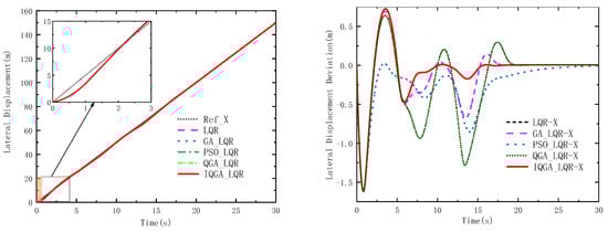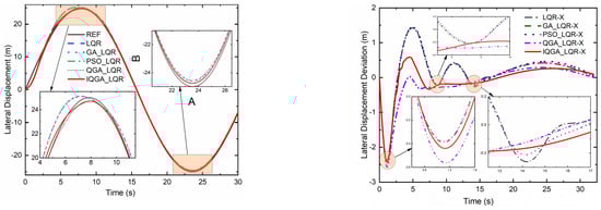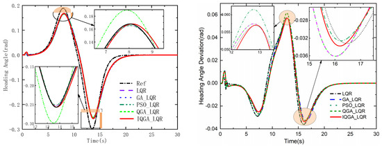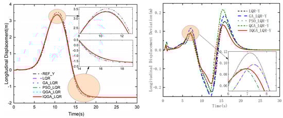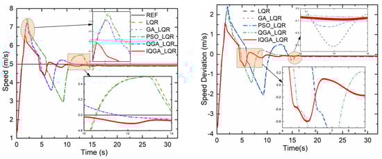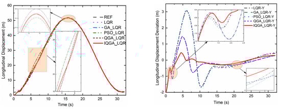 The lateral and longitudinal displacements and their deviations using each controller are plotted in Figure 5 and Figure 6. It can be noted that the peak transverse and longitudinal displacements of the proposed control strategy are significantly reduced, and the deviation fluctuations tend to be flat compared to the other four control methods. Figure 7 and Figure 8 show the heading angle, tractor speed, and their deviations. In Figure 7, the heading angle of the IQGA-LQR control method enters the steady state at the earliest compared to other optimization methods. In Figure 8, the tractor speed of the IQGA-LQR control method has a slight jitter in some periods, but the overall deviation is always the smallest and the first to enter the steady state.