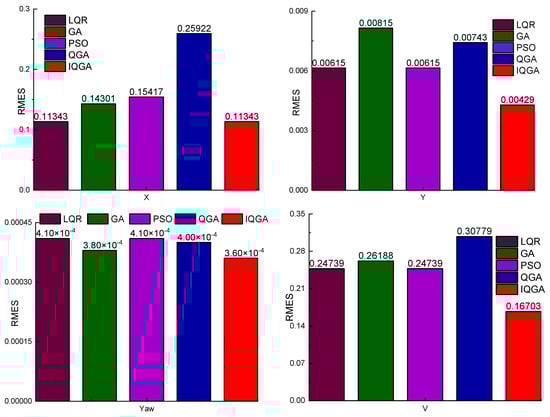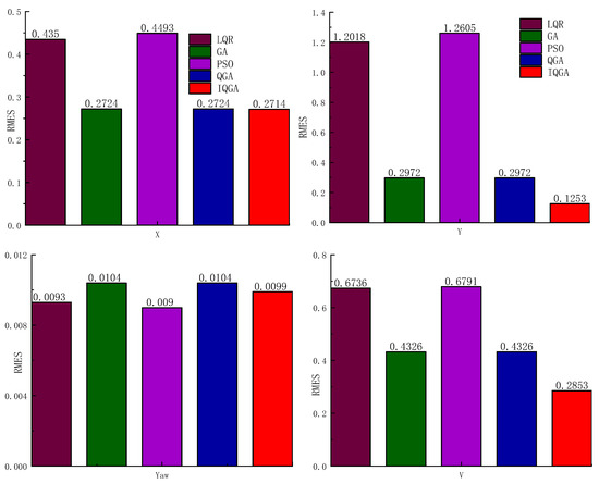 The RMSE values of the kinematic states under circular trajectories are given in Figure 9, from which it can be seen that among the four compared data, the IQGA-LQR RMSE data are the smallest for three and slightly larger for one. These three data are the RMSE values of lateral displacement, longitudinal displacement, the heading angle, and velocity, respectively; the slightly larger one is the lateral displacement of the RMSE value. Figure 10 gives the RMSE values of the motion states under the double-shifted trajectory, from which it can be seen that all four RMSE data of IQGA-LQR are the smallest among the four compared data; therefore, IQGA-LQR is the optimal choice from the RMSE point of view.