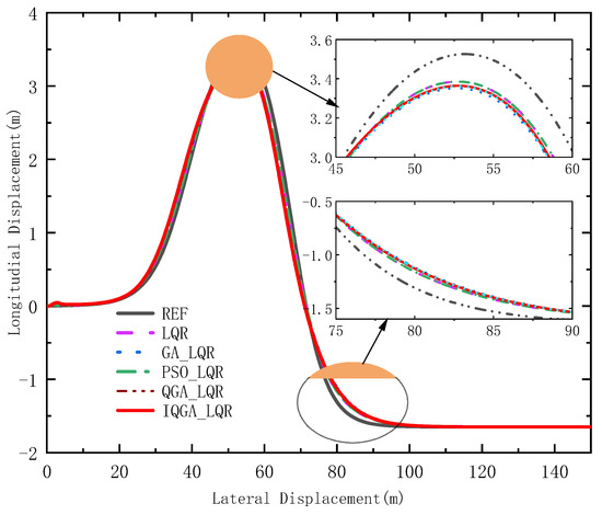 Compared with PSO-LQR, the IQGA-LQR controller reached the maximum value of lateral displacement deviation, and the RMSE value of the tractor had a large reduction by 80.11% and 39.59%, respectively, while the minimum value of the lateral displacement deviation did not increase much, and its upward value was 7.84%. The maximum value and RMSE of longitudinal displacement deviation decreased by 85.01% and 90.06%, respectively, while the minimum value of longitudinal displacement deviation increased by 40%; the maximum value and RMSE of the heading angle deviation increased by 5.81% and 10%, respectively, while the minimum value of the heading angle deviation decreased by 28.18%. The maximum value of the speed deviation and RMSE decreased by 36.25% and 57.99%, respectively, while the minimum value of the speed deviation increased slightly by 0.7%.