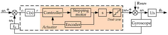 The dead zone is inevitable in the actuator with the reducer mechanism. With the increasing development of control strategies and precision machining, the influences of the dead zone have been decreased greatly. Actuators with stepping motors and belt transmission have been gradually used as a low-cost scheme in recent years. This type of actuator can obtain high precision in the position control with an integrated encoder, and has been widely used in facilities such as robot arms, pan–tilt control, and antenna mounts. Due to the particularity in driving the stepping motor, it can work with a step speed regulation (SSR) mode in the velocity loop control only. The dead zone of the SSR mode affects the accuracy in the velocity loop, especially in a low-speed output situation by the reducer mechanism [22]. Although it presents good performance in the position loop control, the actuator causes many problems in the application of the inertial stabilized control system when working in the SSR mode, such as the great enlargement of the level of angular bias to the field of vision (FOV) on the camera stabilized platform for virtual reality (VR) navigation systems. As the miniaturized camera stabilization platform seeks performance improvement and cost reduction simultaneously, these problems are common in low-cost actuator systems and affect the control precision, which needs to be solved immediately. To deal with the problems mentioned above, a feedforward strap-down control with an LESO compensator is proposed.