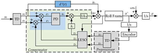 Considering the strap-down system in this research, the approximate linear model is used with the feedforward to implement the stabilized control of the camera platform in Figure 5, and deservedly caused angular bias to the level of the FOV. Then, the compensator is designed to deal with that problem, which is caused by the dead zone and nonlinearity of the actuator in the control process. Moreover, a preprocessor for the state variables with the tracking differentiator (TD) is proposed to modify the LESO, which has the advantages of simple design, fewer parameters, and suitability in engineering applications [27,28]. These modifications can solve problems during communication and data sampling from the actuator module, which introduces the time delay and nonlinearities to the state variables.