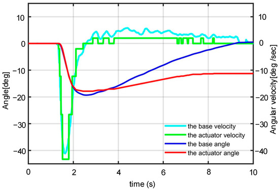 The simulation result is demonstrated in Figure 6. s1 is the base angle and s2 is the base velocity, which is the input of the feedforward control. The gain of the feedforward is kf = 1/4.52, which is the inverse of the linear part of the dead-zone model. With the control signal us = kf·s2, the output velocity of the actuator is α′, in which the influence of the dead zone is expressed as α′ = d(r) + ωs(r), r = us. Obviously, the output velocity α′ cannot track the base velocity s2 accurately due to the disturbance ωs(r). As shown in the result, the disturbance in the angular velocity is integrated and leads to an angular bias. There is about a −11° bias in angle when finishing the simulation at 10 s. Moreover, the feedforward input s2 changes rapidly from 1.2 s to 2.5 s in the tracking process, and can be tracked by the actuator velocity accurately, with an angular bias of less than 3°. In contrast, the angular bias increases after 3 s when the base velocity s2 changes moderately. It is concluded that the feedforward control presents a better time response performance when the input reference changes rapidly.