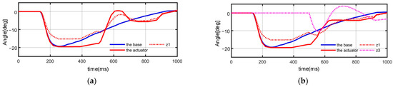 The performance of the LESO on observing the angle of the actuator with z1 is shown in Figure 7. It is implemented at 5 s to track the angle α and obtain a stable trajectory after 9 s. The overshoot of z1 is within 5° during the tracking process. Figure 7a illustrates the performance of the feedforward control based on the approximate linear model solitary. At the end of the process, the angular bias in tracking is about −11° for lagging. As a contrast in Figure 7b, the compensator is implemented with the control signal uc = kpe1. The angular bias is −7°at the end with the compensation.