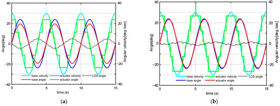 In contrast in Figure 9b, the input reference is s0 = Asin(ωt), which is the attitude angle that can be acquired from the INS on the base. Let A = 25, ω = 0.4π. The parameters of the compensator are set in Table 3, which are turned online with the method in [27]. With the compensator, the actuator can track the input order accurately, even if errors of velocity between the actuator and the base exist. The roll angular trajectory of the LOS illustrates that the maxim angular bias is within ±2°. Obviously, the better performance of the control schema can be approved by the results of the simulation.