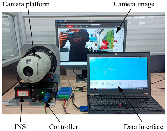 In order to verify the effectiveness of the proposed control scheme further, the devices for the experiment are constructed, as shown in Figure 11. The camera is installed in the pan–tilt platform with roll and pitch axis gimbals, and the image is displayed by the displayer. The control module and the INS are on the base of the rack. The control strategy for the stabilized platform is programed in the computer, by which the data of the platform during the experiment can be displayed and saved. The communication is used to transmit the data between the modules above. The detailed parameters of the hardware are shown in Table 5 and Table 6.