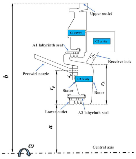 The model in this study is shown in Figure 1. It includes three cavities, noted as C1 to C3 cavities. The C1 cavity is a typical rotor–stator cavity with centrifugal through-flow. The C2 cavity is a co-rotating cavity, which is a simplification of the flow path to the rotor blade. The C3 cavity is a pre-swirl cavity, which is the main research object. The main geometric parameters are shown in Table 1. The pre-swirl nozzle is on the stator, which is slightly below the receiving hole in the radial direction. The cooling air enters the C3 cavity in the form of pre-swirl jet flow and mixes with the gas in the disk cavity. Then, the essential flow enters the receiving hole, while the minor flow goes through the A1 labyrinth seal into the C1 cavity. It finally leaves the C1 and interacts with the hot main flow at the upper outlet.