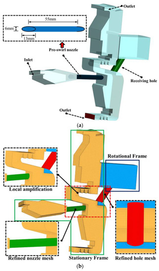 where cp is the isobaric-specific heat capacity, and its value is 1.039. Tout* is the relative total temperature at the outlet of receiving hole. Tin* is the total temperature at the inlet of the pre-swirl nozzle.