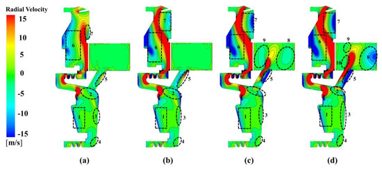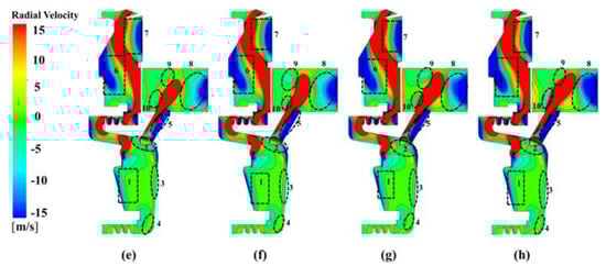 The radial velocity is important in finding the circulation of air in a rotor–stator cavity. With different nozzle inlet pressures at Re = 9.5172 × 105, the distribution of radial velocity on the meridional section is shown in Figure 3. In the C3 cavity, the flow in region 1 and region 4 (near the rotor) mainly moves radial outward. On the other hand, it flows toward the shaft below the nozzle in region 3. At the entrance of receiving hole, there is a vortex (see the region with different flow directions in region 2). In the receiving hole, we can see that there is a backflow area (region 5). Its scope enlarges with increasing at . The results indicate that the flow resistance is large in such a region. In the C1 cavity, there are two backflow areas, namely region 6 and region 7. The backflow in region 6 is a typical flow distribution near the stator, while the backflow in region 7 is related to the change of rotor shape and the existence of a rim seal. In the C2 cavity, there is a backflow area (region 8), although the C2 cavity is co-rotating. This is attributed to the formation of a vortex in this region due to the strong jet flow. The distributions of radial pressure are similar for other speeds of rotation. The results show that the pre-swirl nozzle and receiving hole do not match well. Some modifications have to be made to improve performance at low rotation speeds.
