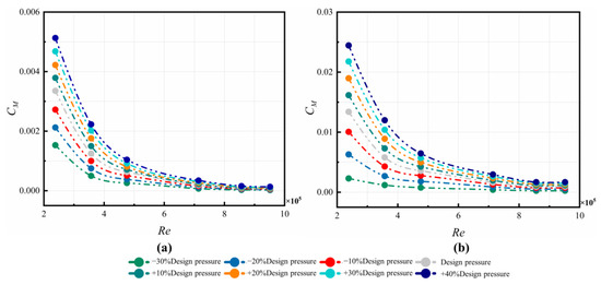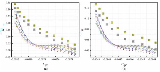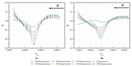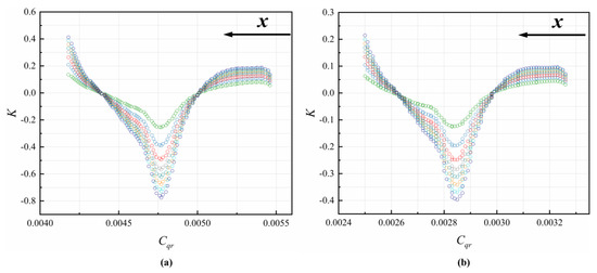 In order to predict the axial thrust, the pressure distribution along the radius of the disk should be estimated. In a typical rotor–stator cavity, the flow pattern changes as Cqr increases with either centrifugal or centripetal non-pre-swirl through-flow. The relationship between K and Cqr for different Re in the C1 cavity of this paper is shown in Figure 4. The values of K firstly decrease, then increase with increasing Cqr. The decreasing trend happens in the backflow area (mainly region 6 in Figure 3). With increasing , the values of K in this area become small. The reason for this is that the leakage flow rate is larger with larger values of . The work performed by the rotor on the volumetric flow drops. When x further increases, the values of K start to increase in most cases, except for cases where hot gas is ingested (see the radial velocity at the outer radius in Figure 3a) from the main flow passage through the rim seal.