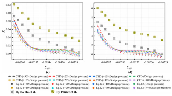 The distribution of K in the C3 cavity is shown in Figure 5. Above the receiving hole, the results fit relatively well with Equation (11). Below the pre-swirl nozzle, a relatively large difference occurs. Therefore, we determined a leakage flow term and extended the correlation in Ref. [40], which can be written in Equation (12). The results are compared in Figure 4. As Cqr increases, the values of K firstly significantly drop and almost remain the same. When Cqr further increases, the values of K gradually drop. The results from Equation (12) are in good agreement with those from numerical simulation with different and different Re, compared with those in Refs. [38,39,40,41].