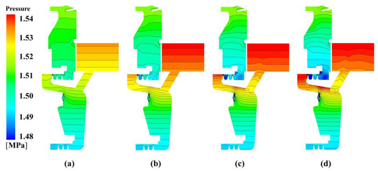 The radial pressure distribution on the meridional section is depicted in Figure 6 for different inlet pressures at Re = 9.5172 × 105 (at 0.5 times the maximum rotational speed). It can be seen that the pressure in the C3 cavity rises with increasing . Near the inlet of receiving hole, there is a relatively high-pressure zone for . The rise of also results in the increase of the pressure gradient from the pre-swirl nozzle to the outer labyrinth seal in C3. The high-pressure zone enlarges as increases. Conversely, the pressure at the outlet of the receiving hole minimally changes. In the downstream C1 cavity, there is a low-pressure zone downstream of the inner labyrinth seal. The scope of the zone increases with increasing . With a larger pressure difference at either side of the labyrinth seal, the leakage flow rate is expected to increase.