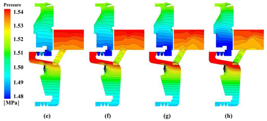 Pressure distribution of pre-swirl cavity at Re = 9.5172 × 105 with different nozzle pressure: (a) −30% design pressure, (b) −20% design pressure, (c) −10% design pressure, (d) -design pressure, (e) +10% design pressure, (f) +20% design pressure, (g) +30% design pressure, and (h) +40% design pressure.
