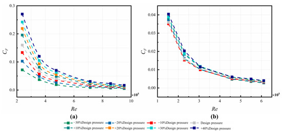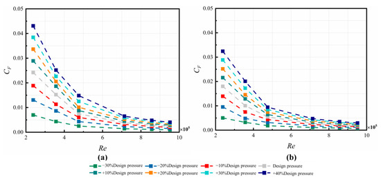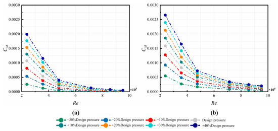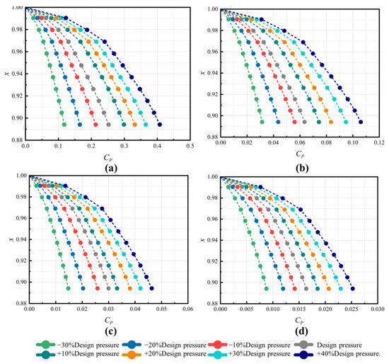 Since the axial thrust is an important parameter for the safe operation of a gas turbine, the radial distribution of pressure coefficient Cp was compared. The reference pressure was taken at the radius of labyrinth A1 from numerical simulation. Since the pressure drop is radial inwards, the values of the pressure coefficient Cp are positive, as depicted in Figure 7. In all the cases, the increasing trend of Cp towards the shaft are similar. The parameter Cp is positively correlated with at each Re. When the Reynolds number is large, the Cp increases with the nozzle inlet pressure, but the increments are small, and the effect of increasing on Cp is relatively weak. The flow below the pre-swirl nozzle is mainly controlled by the strong swirl flow in the C3 cavity and the pressure ratio is less influenced by at this point. The larger values of cause the more severe pressure difference along the disk.