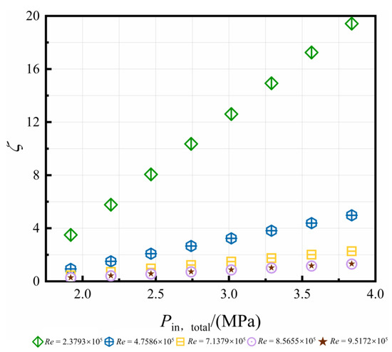 In this paper, we estimate the non-dimensional pressure drop ζ to predict the capacity of cooling air delivery. It is defined in Equation (13). The variation of ζ are plotted in Figure 8. The values of ζ increase with the total pressure at the nozzle inlet. With the increase of Re, the dominant rotation is strong in C3, and the values of ζ are less influenced by . When Re reaches the maximum value (9.5172 × 105), the increment rate of ζ is less than 2%.