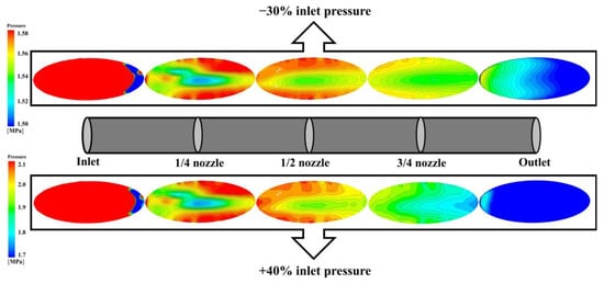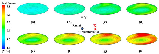 Distribution of total pressure on the middle section of receiving hole at Re = 9.5172 × 105 with different nozzle pressure: (a) −30% design pressure, (b) −20% design pressure, (c) −10% design pressure, (d) design pressure, (e) +10% design pressure, (f) +20% design pressure, (g) +30% design pressure, and (h) +40% design pressure.