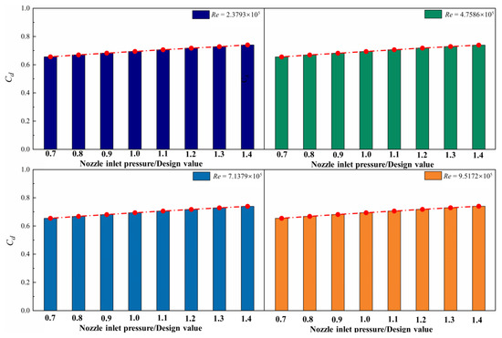 Figure 11 reflects the variation of versus for the pre-swirl nozzle at four different Reynolds numbers. These values show an increasing trend versus . The maximum relative increment is up to 2% when Re increases from 2.39 × 105 to 9.5172 × 105 at a fixed .