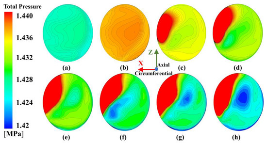 Distribution of total pressure at the middle section in the pre-swirl nozzle at Re = 9.5172 × 105 with different nozzle pressure: (a) −30% design pressure, (b) −20% design pressure, (c) −10% design pressure, (d) -design pressure, (e) +10% design pressure, (f) +20% design pressure, (g) +30% design pressure, and (h) +40% design pressure.
