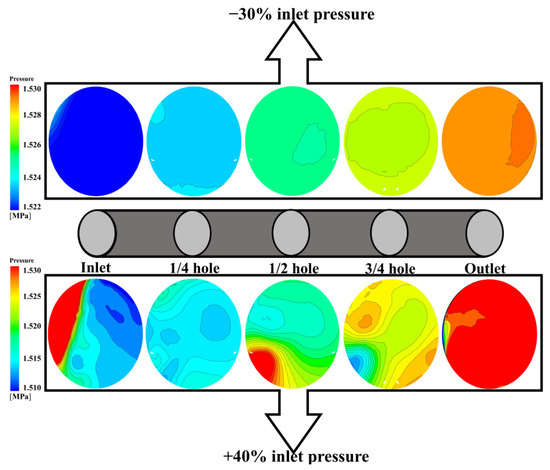 The static pressure distribution of each section at different axial positions of the receiving hole with either maximum or minimum pin,total is shown in Figure 13. The values of pressure increase along the passage of the receiving hole. At the same axial position, the pressure is large with an increase in pin,total. At the minimum pin,total, there is a region with large pressure. When the air flows through the passage of the receiving hole, the pressure violently fluctuates. At the outlet, the pressure reaches the maximum value, which indicates the most flow resistance.