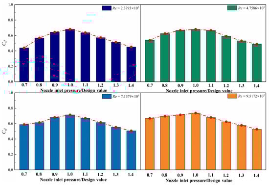 Distribution of flow rate coefficients of pre-swirl nozzle at different Re.
