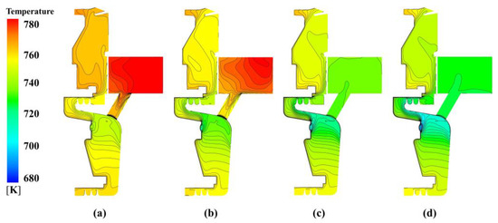 where T is the temperature, Tmax is the maximum temperature in the cavity, Tmin is the minimum temperature in the cavity, cp is the isobaric-specific heat capacity, and its value is 1.039. Tout* is the relative total temperature at the outlet of receiving hole. Tin* is the total temperature at the inlet of the pre-swirl nozzle.