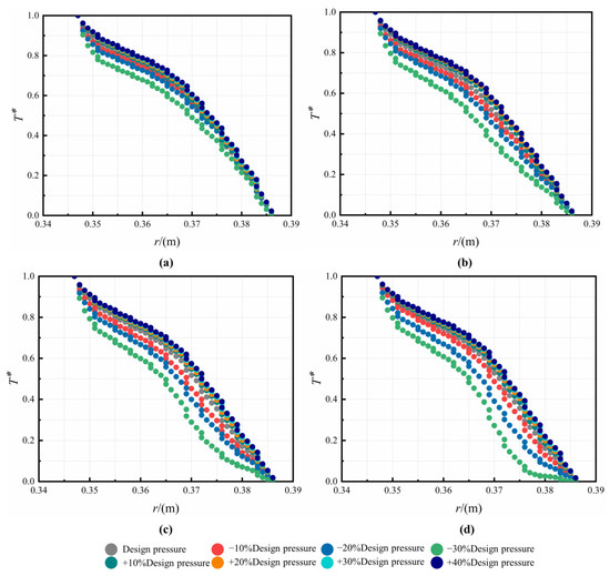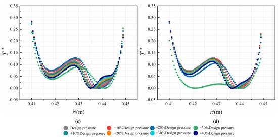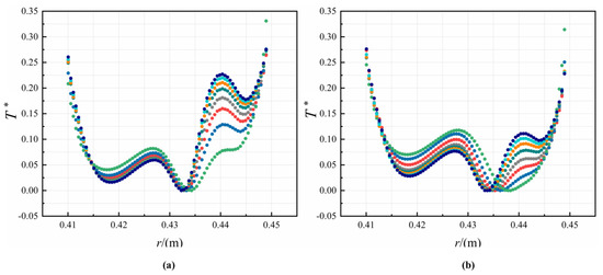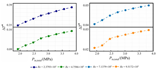 In Figure 16, the radial distribution of T* in the C1 cavity at different Re is depicted. It can be observed that T* in the C1 cavity has a general tendency to fall and then rise along the radial direction, and there is a low-temperature zone in the middle section of the cavity. As the nozzle inlet pressure increases, T* is negatively correlated at the high and low radius of the C1 cavity, but a positive correlation in the middle section, and the variation is greater in this area. When the speed increases, the relative velocity between the rotor and the gas decreases, this reduces the heat transfer effect of the gas on the rotor and causes an upward shift of the low-temperature zone. The temperature in the C3 cavity decreases in the radial direction, as shown in Figure 17. When the pre-swirl jet flow enters the C3 cavity, it is mixed with the cavity flow and then impinges on the rotor. With the increase of Re, the change of T* is small. On the other hand, the values of T* decrease up to 21.4% when the decreases. This can be explained by the more intense impingement cooling and swirl flow cooling.