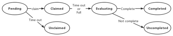 In order to improve the control of crowdsourcing design services, this paper constructs a task-state machine that describes all the states of a crowdsourcing design task. There exist six states: Pending, Claimed, Unclaimed, Evaluating, Completed, Uncompleted. The task state will shift according to the user’s input in the application layer or the smart contract’s determination of the current task state, as shown in Figure 5, which illustrates the process and reasons for the task-state change. Whenever a task publisher posts a new task in the application layer and it is recorded on the blockchain, the system will automatically generate a task-state machine that tracks the status of the task and can be used by all users to query the current status of the task at any time.