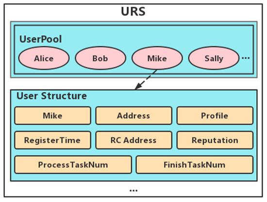 URS contract is mainly used for user registration and managing user information. Users can complete registration without using their real identity information, providing them with a certain level of privacy protection. The main structure of the contract is shown in Figure 7, where a total set of users, UserPool, and a series of data structures recording the user’s details are provided. Each user’s data structure records Username, Address, profile, RegisterTime, Reputation, the number of ongoing crowdsourcing design tasks (ProcessTaskNum), the number of finished crowdsourcing design tasks (FinishTaskNum) and a list of addresses of completed tasks (RC Address). The reputation is an important parameter; the system will issue the default reputation value after the user completes the registration, which will be updated automatically with the user’s work performance in the future. The incentive mechanism of reputation value is based on the literature [16], where the level of reputation value directly can reflect the user’s level of crowdsourcing design. ProcessTaskNum reflects the user’s current level of busyness. FinishTaskNum combined with Reputation reflect the user’s ability to work. RC Address reflects the main areas of work of the user. None of the above data can be easily altered by third parties and can only be updated automatically after a crowdsourcing design task. Therefore, using the above parameters as criteria for receiving tasks ensures that the worker has sufficient time and capacity to complete the task.