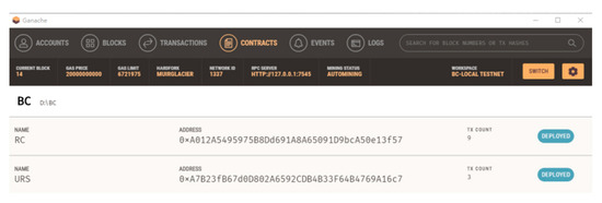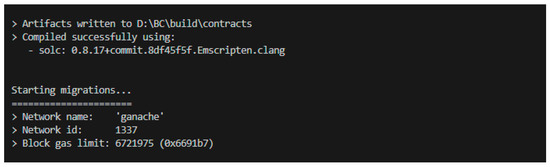 The compilation and deployment of the smart contract is completed using commands in the operating system terminal, as shown in Figure 10. The ABI of the smart contract will be generated after compilation, which is used to call the functions in the smart contract and implement the data storage. This is successfully deployed to the Ganache client, as shown in Figure 11.