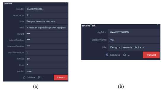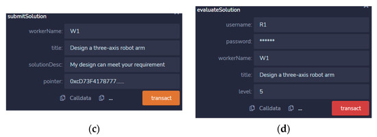 As shown in Figure 13, the requester R1 posts a task titled “Design a three-axis robot arm” on this crowdsourcing design platform, and the worker W1 receives and submits the task. One must simply follow the prompts to enter the corresponding crowdsourcing design task information and then initiate a transaction to complete the interaction with the blockchain and accomplish the crowdsourcing design service.