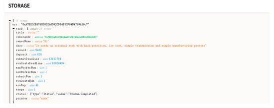 Figure 15 shows the traceability information of worker W1’s completion of the crowdsourcing design task recorded on the chain. The traceability information details the address information of the worker, the time of receiving the task and the time of submitting the task, a brief description of the task and the attached retrieval pointer.