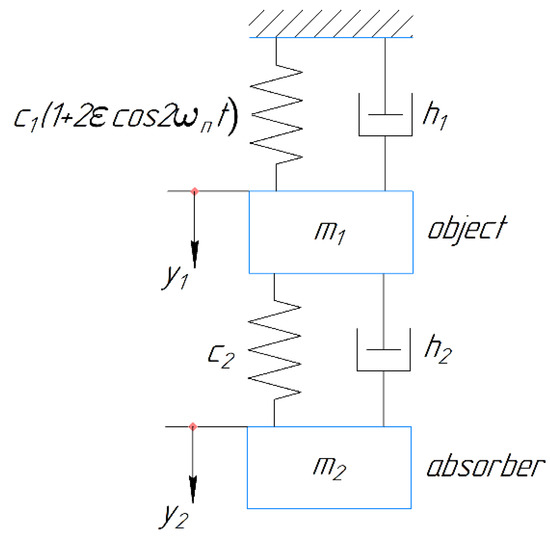 The vibrations of a double-mass system, including an object with variable stiffness and a dynamic vibration damper, can be considered according to the design scheme presented in Figure 1.