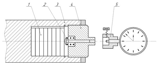 The vibration damper with annular protrusions on the discs 1 is compressed by a spring 4 through a pusher 5. The spring is held by a threaded cap 2, and when it is screwed into the body of the boring bar, the axial compression force N increases. The position of the cover is fixed by a lock nut 3. To determine the direction of action of shock pulses transmitted by the elements of the absorber to the boring bar, a design of a dynamic absorber with annular protrusions on the disks was made. The vibration absorber under study is shock-dynamic and makes it possible to optimize the shock characteristics. It is known that the effect of vibration damping depends significantly on the characteristics of the shock pulse. To increase the impact efficiency, the shock pulse vector is aligned with the axis of symmetry of the disk and its center of gravity. The impact surface of the disk is located in the middle section of the cylindrical surface and is made in the form of an annular protrusion. The shape of the transverse section of the protrusion, which affects the size of the contact area during collisions, is chosen empirically, depending on the efficiency of vibration damping. With optimal grip force, the discs can only move in the direction of the cutting force. The cross-sectional shape of the protrusion and the width of the platform, along which contact is made during impact, is selected depending on the material characteristics from which the disks are made. Note that the shape of the protrusion in the form of an acute angle provides the best damping of the shock pulse. The other two forms of protrusions increase damping in the absorber. The presence of friction in the damper weakens the damping effect. At the same time, the presence of attenuation will expand the frequency range at which the effect of oscillation damping is manifested. When testing the vibration damper, the axial compression forces were determined using a calibration device (Figure 3). When the axial compression force of spring 2, transmitted to disks 1, is changed, pusher 3 moves in the hole of the threaded cover 4. The magnitude of this movement is measured by a dial indicator installed in body 5 of the device, which is fixed on the shank of the threaded cover during adjustment. The device is calibrated by loading the pusher through a dynamometer, with the threaded cover removed from the boring bar.