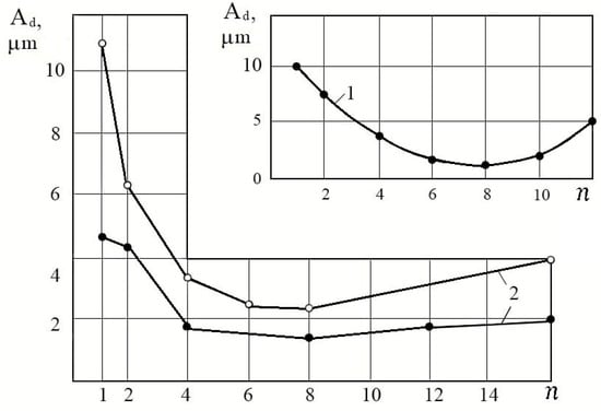 Dependence of the vibration amplitude on the number of elements of the dynamic vibration damper: 1—according to frequency response; 2—when boring; n—number of elements; mm, mm; mm, mm.