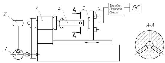 The experimental stand (Figure 5) includes a special boring bar 4 (d1 = 26 mm, l1/d1 = 6.5) with a central axial hole and three radial holes equally spaced from each other, located near the cutter. The boring bar is installed on the spindle head 3 of the finishing and boring machine model 2706B.