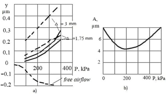 The dependence of elastic displacements y on pressure P at different values of the gap ∆ (Figure 6a) shows that the displacements are directed towards the jet outflow from the boring bar.