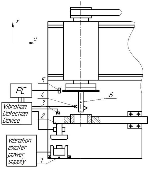 The influence of the vibrations of fixture 2 (x–vibrations) in the feed direction on normal to the surface to be machined y–vibrations of the boring bar 6 was studied on the stand (Figure 7). Inductive sensors 3 and 4 of the vibrations of the fixture and the boring bar are connected to a PC through an amplifier of the vibration detection device, on which pulses from the spindle speed indicator 5 are also recorded.