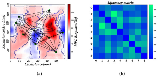 Example of the root graph of WMFLs signals: (a) The root graph of WMFLs signals, with the graph superimposed on top (b) Graph adjacency matrix.